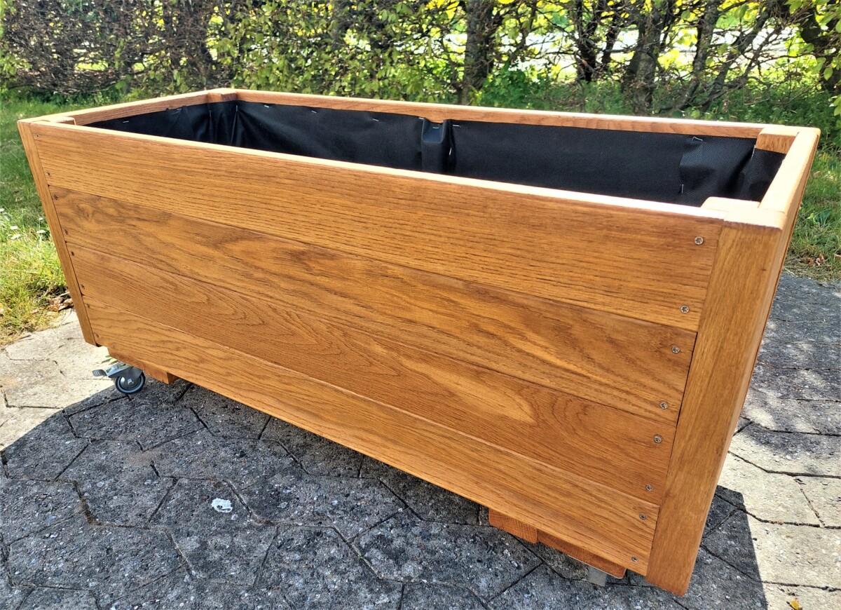 Plantekasse Eivind er lavet af  høvlet og pudset egetræ planker 22mm. Hjørnerne er i stolper 60x60mm.